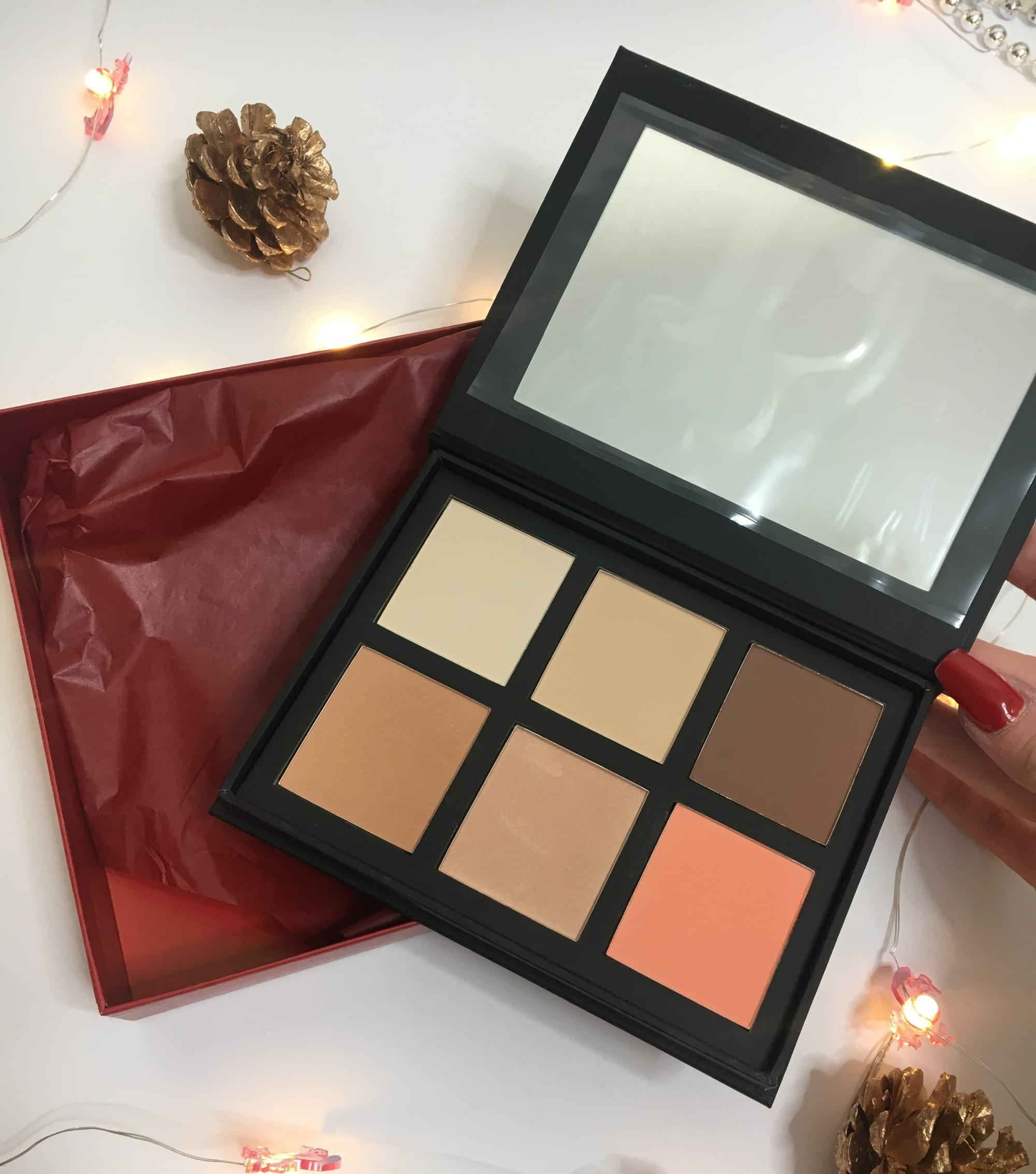 The palette holds six powders, the top row holds 3 different shades of powder foundation to perfect the skin's complexion or to contour and highlight like a pro.