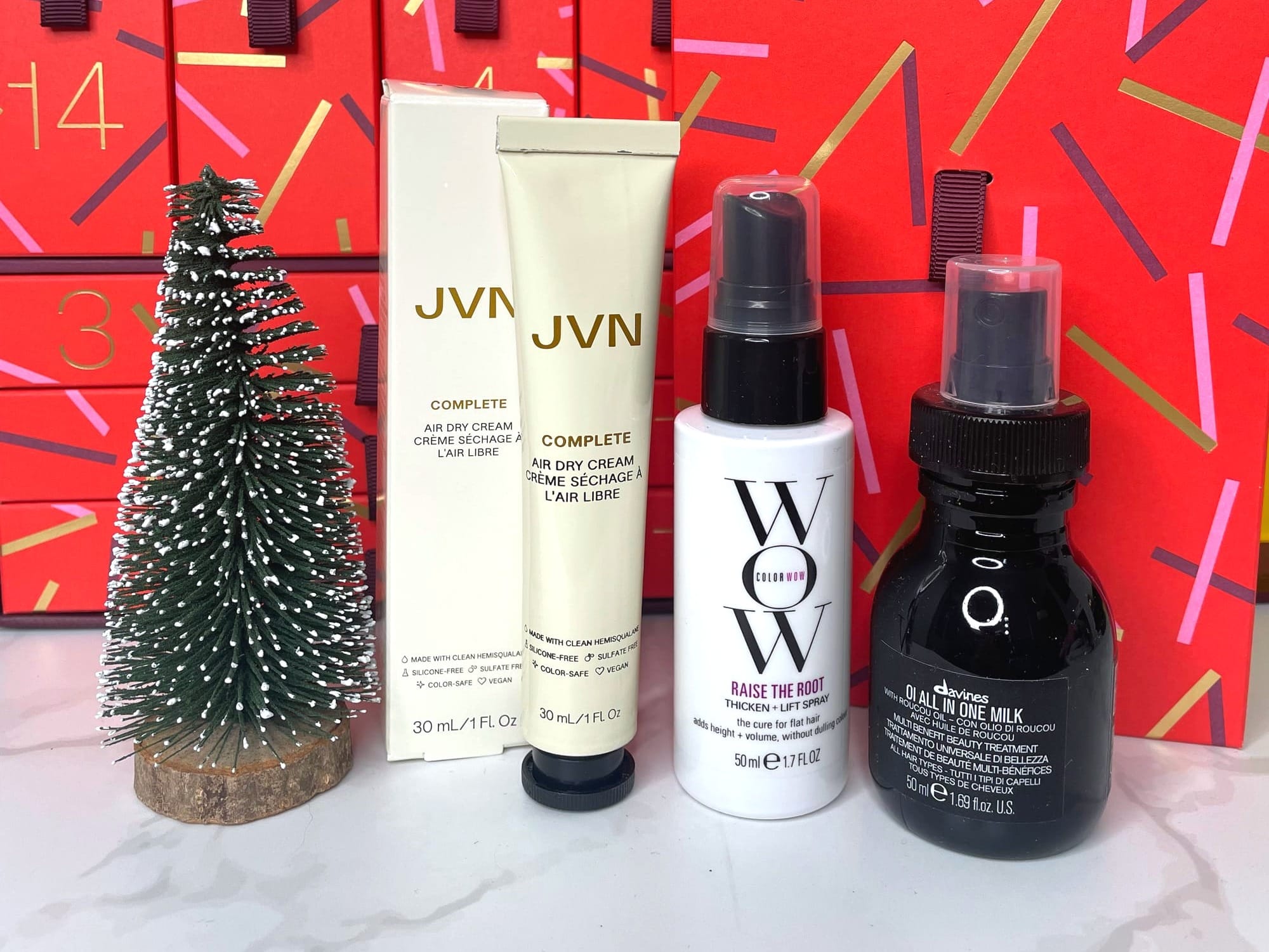 Day 13 – Triple Haircare: Davines OI All in One Milk (50ml – Worth £27.50), JVN Air Dry Cream (30ml – Worth £10), Color Wow Raise the Root (50ml – Worth £12)