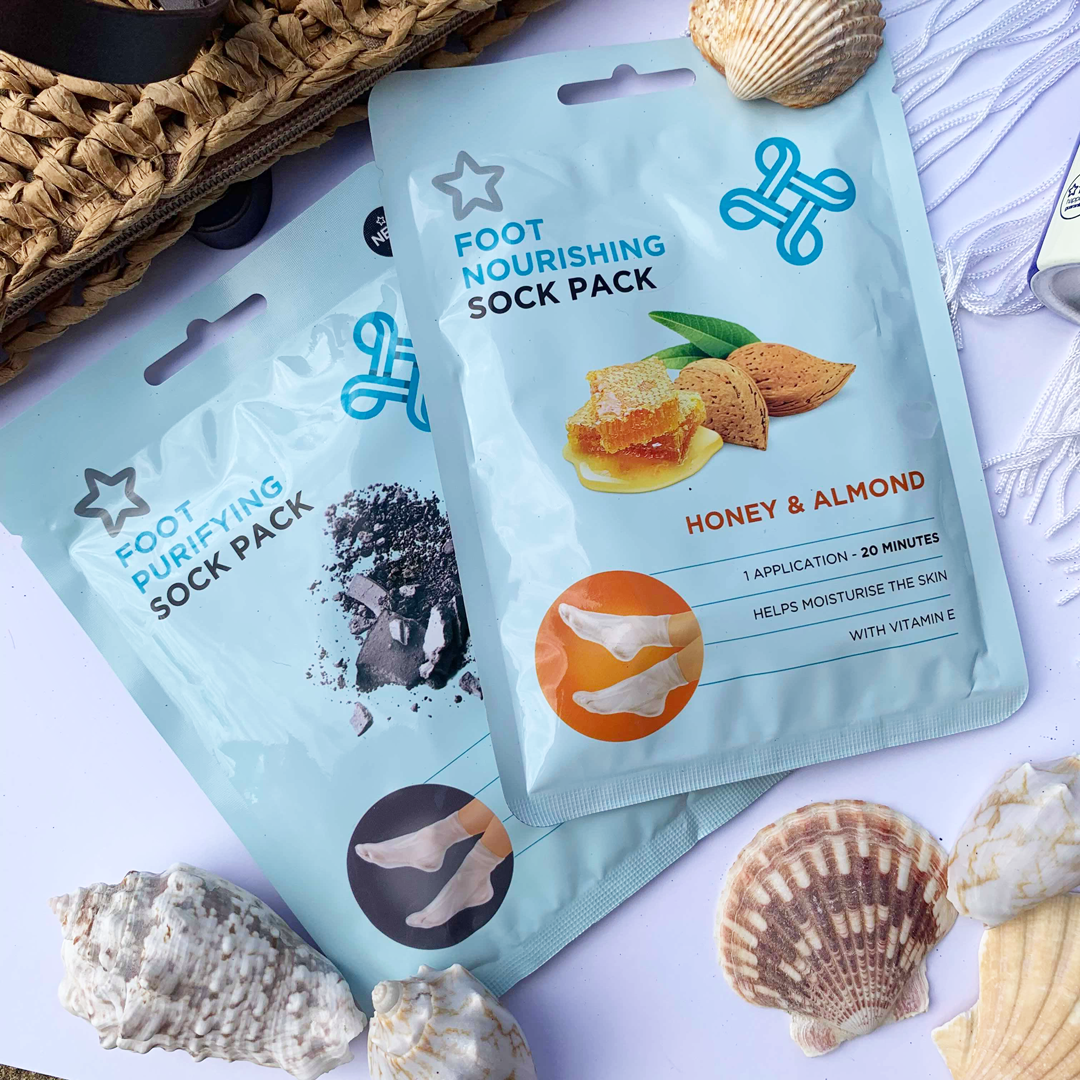 The Superdrug Foot Purifying Sock Pack contains charcoal powder which works to purify the skin on your feet. Like the Honey and Almond pack it also contains Vitamin E plus coconut oil to help soften cracked and dry heels.