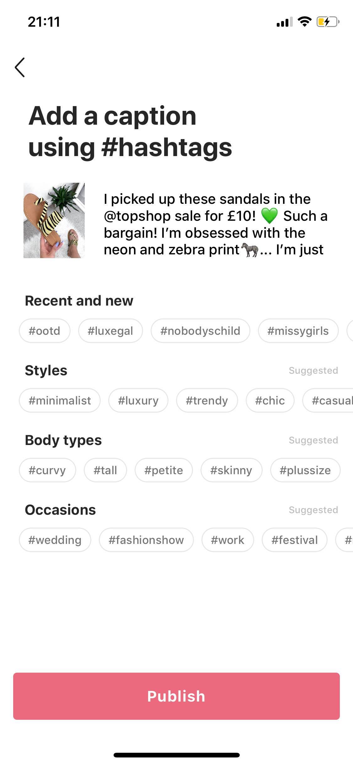 Any time you upload an image to 21 buttons, you add ‘buttons’ to each item (like little stickers) and then you tag the item which you’ve buttoned. You have the option to add a caption to the post and also add hashtags so your post is more likely to be found - much like Instagram.